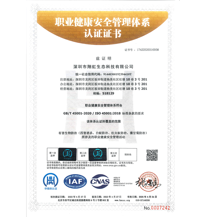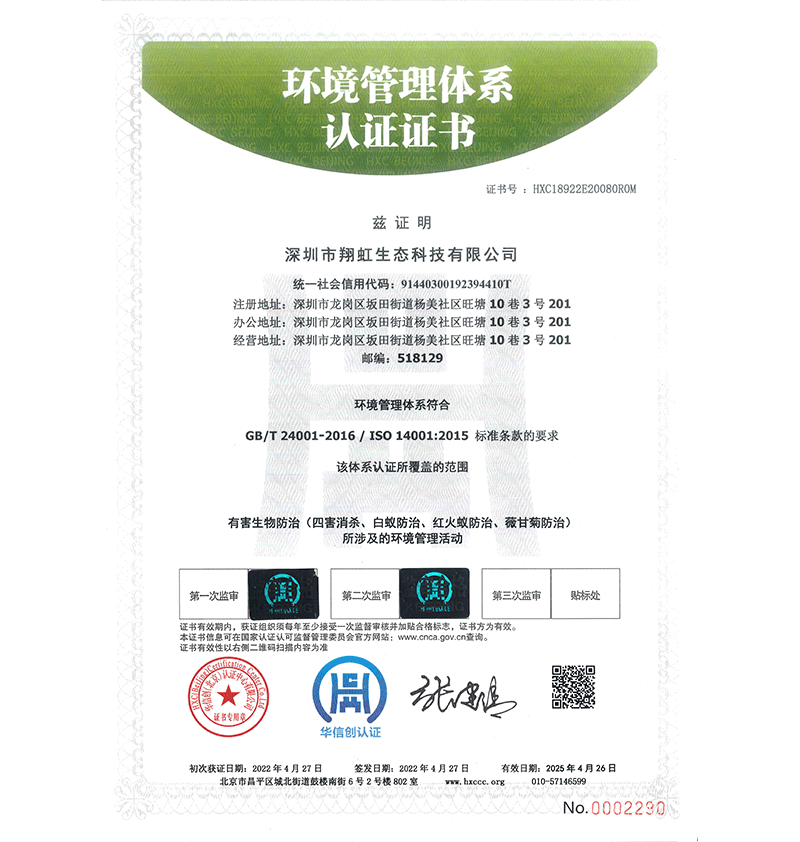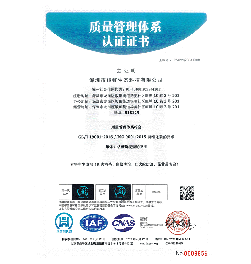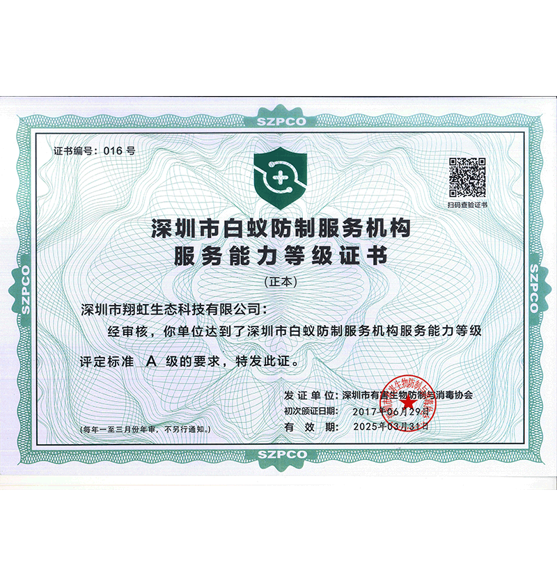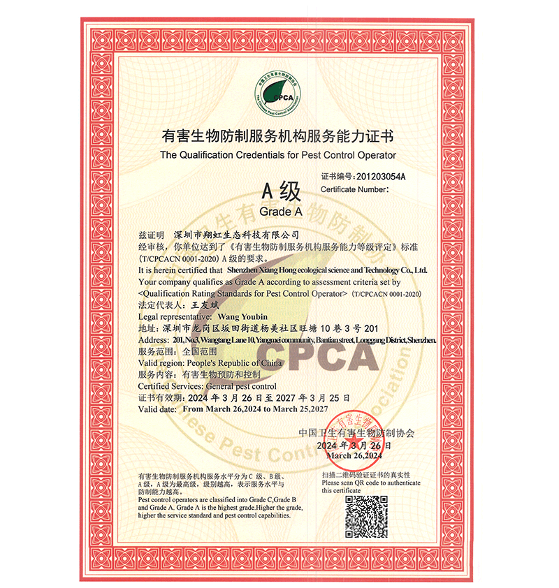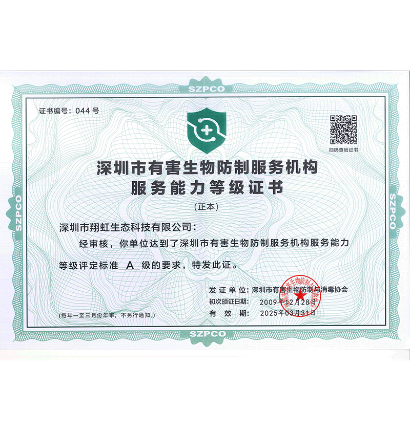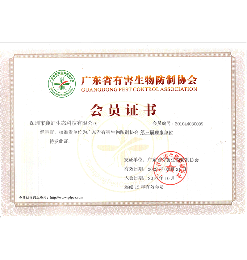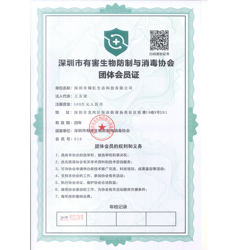 深圳市翔虹生態(tài)科技有限公司成立于1995年,是深圳最早成立的專業蟲害防治公司之一。公司發(fā)展至今獲得全國有害生物防制服務A級資質、廣東省有害生物防制服務A級資質、深圳市有害生物防制服務A級資質、廣東省有害生物防制服務A級資質、深圳市有害生物防制服務甲級資質的單位,是中國有害生物防治協會會員、廣東省有害生物防治協會會員、深圳市有害生物防治協會理事單位,多次獲得“深圳市十佳消殺單位”榮譽。